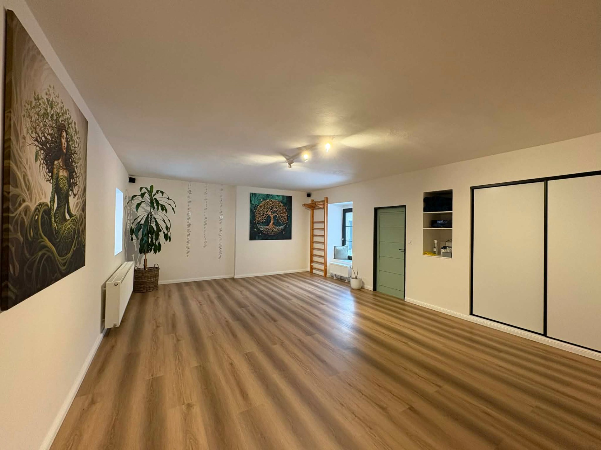 Prostorný sál s vinylovou podlahou a příjemnou atmosférou. Ideální pro jógu, taneční kurzy nebo workshopy.
